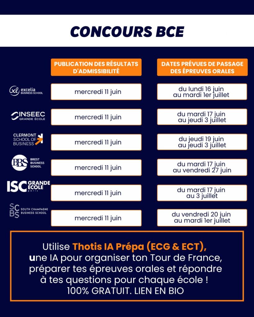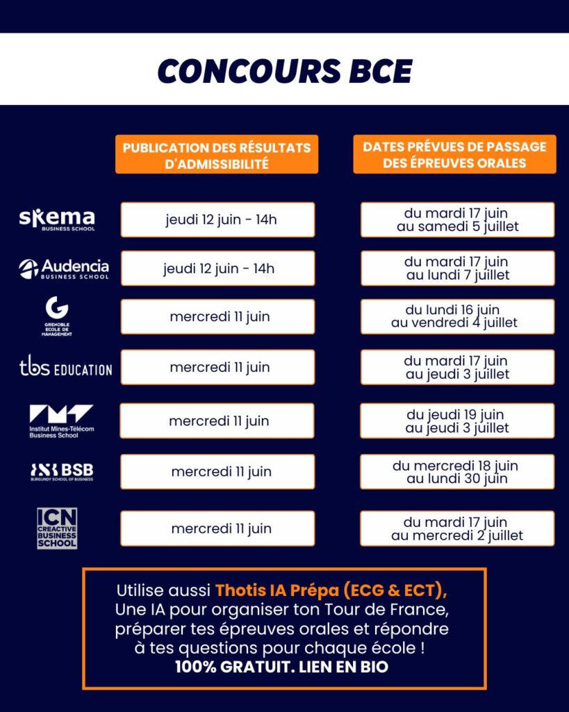 Ces dates sont susceptibles d’être modifiées. Il est donc recommandé de consulter régulièrement le site officiel de la BCE et les sites des écoles concernées pour obtenir les informations les plus à jour. (concours-bce.com)