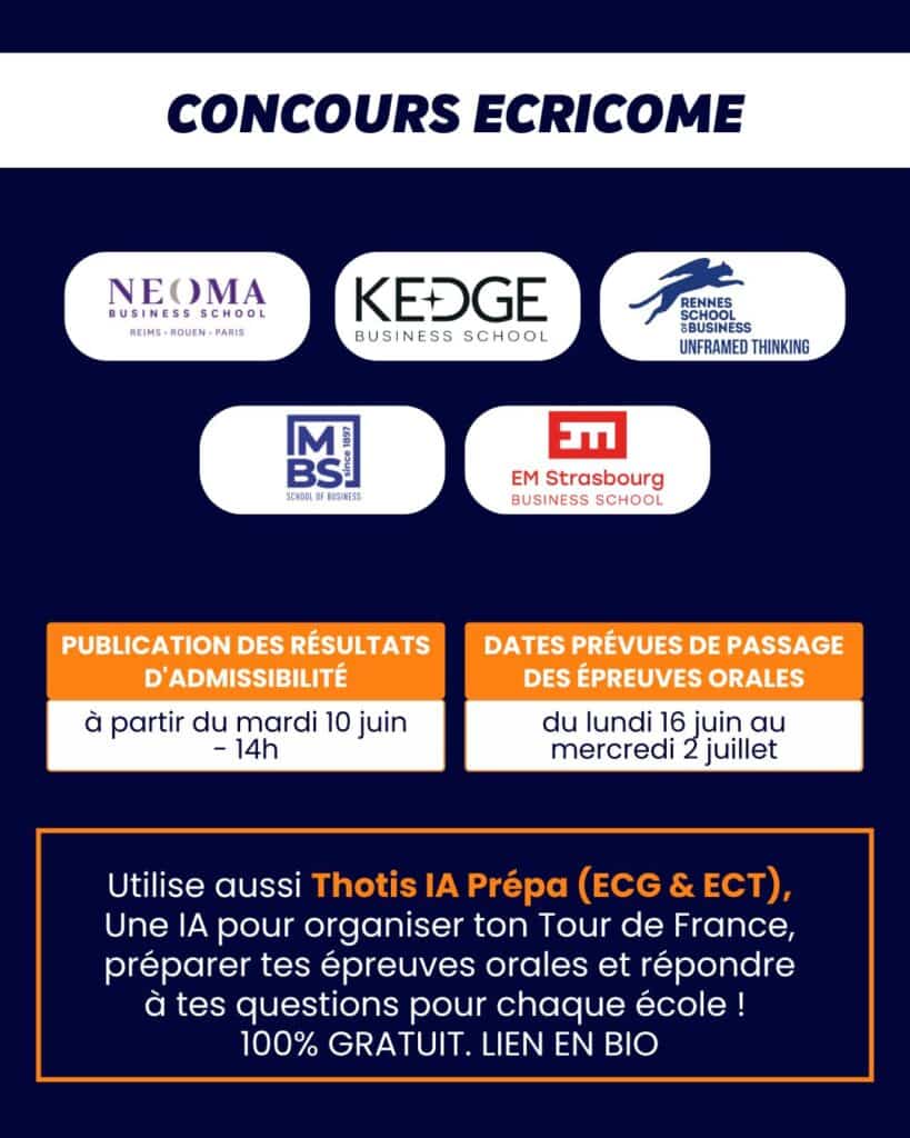Les résultats d’admissibilité vont bientôt tomber, ce qui signifie que les oraux approchent à grands pas : LE moment décisif pour des milliers de candidats aux concours 2025 de la Banque Commune d’Épreuves (BCE) et ECRICOME. Quelles sont les dates à ne pas manquer ? Comment s’organisent les épreuves orales ? Où consulter vos notes ? Dans cet article, on vous partage toutes les informations essentielles à connaître, école par école, pour aborder sereinement cette dernière ligne droite et maximiser vos chances d’intégrer l’école que vous visez.