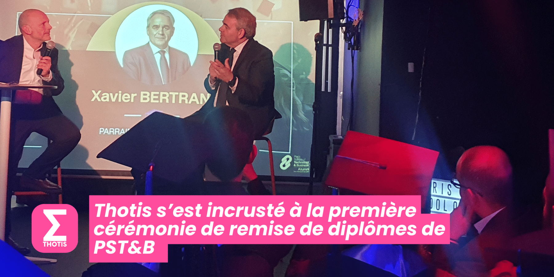Le 25 janvier dernier, l’école PST&B organisait sa toute première cérémonie de remise des diplômes. Événement traditionnel célébrant la fin d’un cursus d’études, cette soirée avait, pour PST&B, une saveur toute particulière. Étaient ainsi présentes, lors de cet événement, les premières promotions d’étudiants de l’école arrivées en 2021, lors de la création de l’école. Pour l’occasion, les étudiants membres des associations organisatrices tenaient le bar et faisaient le service. Ainsi, durant 1h30, plusieurs prises de parole se sont succédées : un discours d’Armand Derhy, Directeur général de PST&B, de Roxanne, major de promo en Bachelor, des responsables des programmes, du corps enseignant, ou encore du parrain de promotion. D’ailleurs, pour représenter les premières promotions d’étudiants lors de de cette première cérémonie de diplômation, l’école a choisi l’homme politique Xavier Bertrand, président du conseil régional des Hauts-de-France. Le choix du parrain devait coïncider avec un certain nombre de valeurs : engagement, responsabilité, valeurs citoyennes, mises en avant par PST&B. Le Directeur général explique ainsi : “pouvoir compter sur Xavier Bertrand comme parrain de promotion est un honneur pour l’école”. Ce dernier a profité de sa tribune sur scène pour donner de précieux conseils aux étudiants, concernant leur insertion dans le monde professionnel et partager quelques anecdotes issues de son expérience. À partir de 23h30, les étudiants pouvaient profiter de la fête grâce aux animations musicales prévues. Le choix du lieu était idéal pour l’occasion, comme le souligne le Directeur général de PST&B : « Nous avons aussi fait le choix d’une scène polyvalente, pratique, capable de se transformer en piste de danse assez rapidement. »